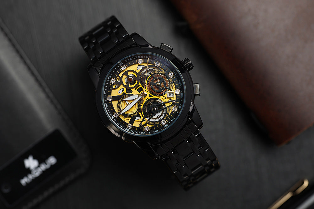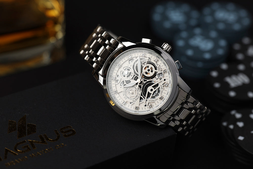 Compared to other similarly designed watches, Magnus branded watches have true custom 3D modeling under the sapphire crystal, unlike paper back watches found elsewhere.